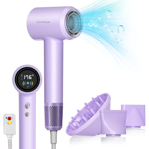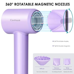 Seque o cabelo rapidamente e com segurança com o secador de cabelo Conhaze Equipado com um potente motor de 110.000 RPM e tecnologia avançada de íons negativos, reduz o frizz, melhora o brilho e mantém a saúde do cabelo. Design portátil e leve com controle inteligente de temperatura e um bocal magnético para um estilo preciso. - Secadores de cabelo profissionais de secagem rápida: o secador de cabelo Conhaze possui um potente motor sem escovas de 110.000 RPM, impulsionando o fluxo de ar de até 23 m/s para uma secagem incrivelmente rápida. Seque o cabelo em apenas 2-8 minutos. Seja você um estilista profissional ou um usuário doméstico, seu desempenho poderoso garante sessões de estilo eficientes com facilidade. - Tecnologia avançada de controle térmico: experimente controle de calor superior com a tecnologia de sensor T inteligente duplo. Este recurso inovador monitora a saída de calor impressionantes 500 vezes por segundo, garantindo uma regulação precisa da temperatura. Diga adeus aos pontos quentes e à exposição excessiva ao calor com um secador de cabelo, reduzindo o risco de danos ao cabelo enquanto alcança resultados consistentes e de qualidade de salão. - Tela HD com configurações personalizáveis: desfrute de experiências de secagem personalizadas com cinco configurações de calor (temperatura ambiente/41.7 °C/55.0 °C/60.0 °C/80.0 °C) e duas configurações de velocidade (suave/rápido). Os níveis de velocidade e temperaturas são exibidos em uma tela LCD HD para facilitar o ajuste com base no tipo de cabelo e necessidades de estilo. O secador de cabelo Conhaze funciona com um botão frio ing. - Acessórios magnéticos rotativos de 360°: o secador Conhaze melhora a versatilidade do seu estilo com três acessórios magnéticos incluídos: um bocal de alisamento para acabamentos elegantes; um bocal de estilo para um estilo preciso; e um difusor de estilo o torna ideal para cabelos cacheados. Escolha de acordo com suas necessidades de penteado. Mais conveniente. Não se preocupe com escorregar. - Sem frizz, resultados de qualidade de salão: Eleve sua rotina de cuidados com o cabelo com a capacidade do secador de cabelo Conhaze Ionic de emitir milhões de íons negativos. Estes íons combatem o frizz, deixando o cabelo sedoso e manejável, lembrando um acabamento de salão profissional. Desfrute de resultados consistentemente impressionantes que mostram o brilho e a saúde do seu cabelo. - Protable leve, super baixo ruído: o secador de cabelo Conhaze é compacto e portátil, perfeito para casa e viagens. Funciona silenciosamente abaixo de 60 dB, uma experiência de estilo sereno sem interrupções, perfeita para o início da manhã ou ambientes profissionais onde uma atmosfera calma é primordial. Ideal como presente para amigos e familiares.