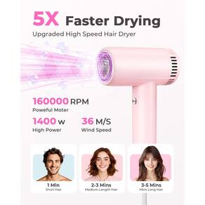 - Secagem rápida em 1 minuto e economize tempo: diga adeus aos longos tempos de secagem! Nosso motor de alta velocidade de 160.000 RPM proporciona um impressionante fluxo de ar de 36 m/s, secar cabelos curtos em 1 minuto, cabelo médio em 2-3 minutos e cabelos longos em 4-5 minutos — 5 vezes mais rápido do que os secadores de cabelo tradicionais. Se você tem cabelos grossos, encaracolados ou finos, este secador de cabelo profissional garante uma secagem rápida e eficiente sem comprometer a saúde do cabelo.
