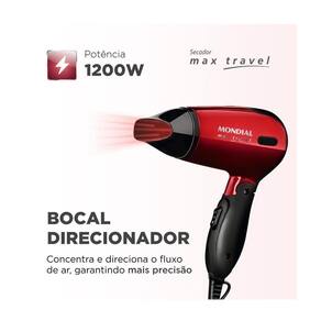 Secador de cabelo mondial max travel 1200w bivolt - sc-10potente e compacto: leve seu secador para onde quiser o secador max travel é a melhor opção para suas viagens. Por conta do cabo dobrável, cabe na bolsa ou mala com facilidade. Além disso, possui 1.200w de potência e proporciona uma secagem rápida.Características do produto:- portátil: cabo dobrável: o max travel tem design leve e compacto, além de cabo dobrável. Você dobra e encaixa seu aparelho na bolsa ou na mala com facilidade. Incrível, né Leve seu secador para qualquer lugar.- 1.200w: potência suficiente para deixar seu cabelo seco, modelado e lindo com rapidez e eficiência.- bivolt:: use seu secador de cabelo em qualquer tomada: 127v e 220v.- bocal direcionador de ar: o acessório concentra e direciona o fluxo de ar, proporcionando uma secagem mais precisa.- 2 velocidades + 2 temperaturas: escolha o que mais se adequa ao seu tipo de cabelo.- alça para pendurar: ajuda a pendurar o secador durante o uso e facilita o armazenamento.Especificações técnicas:modelo: sc-10voltagem: bivoltpotência: 1200wcor: preto/vermelhocontrole de velocidade: 2níveis de temperatura: 2comprimento do cabo: 1,50mgrade traseira removível: simjato de ar frio: simgarantia: 12 meses pelo fabricante Ean: 7898578151223