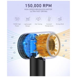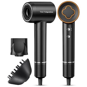 O Secador de Cabelo Cosy Companions é equipado com um motor sem escova de alta velocidade de 150.000 RPM, fornecendo um fluxo de ar potente com velocidade de 36ms para secar o cabelo em pouco tempo, 5x mais rápido do que secadores tradicionais. Com tecnologia iônica negativa, libera 500 milhões de íons negativos durante o processo de secagem para equilibrar a eletricidade estática, reduzir o frizz e manter a umidade, deixando os cabelos macios, volumosos e brilhantes. Com baixo ruído de 51dB, é seguro e confortável de usar. Possui controle inteligente de temperatura, evitando danos por superaquecimento, com LEDs indicando a temperatura. Leve e portátil, ideal para casa e viagens.
