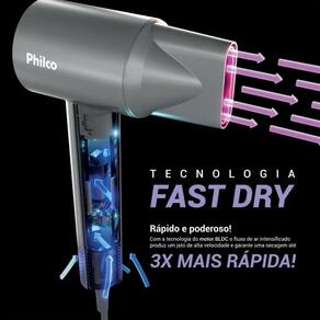 Experimente o Secador de Cabelo Fast Dry Philco e tenha resultados de salão sem sair de casa. Com 1600W de potência, o secador Philco proporciona uma secagem ultrarrápida e silenciosa. Seu motor BLDC, aliado à tecnologia Fast Dry, oferece performance superior, gerando um fluxo de ar que seca até 3x mais rápido, e o melhor: com baixo nível de ruído. Para facilitar o seu dia a dia, o bocal concentrador e a grade são magnéticos, o que torna o encaixe, a limpeza e a manutenção muito mais simples. O secador conta com quatro opções de temperatura, quente, morno, frio e mista, além de duas velocidades, para que tenha até oitos combinações diferentes. Essa flexibilidade é perfeita para adaptar a secagem ao seu tipo de cabelo.