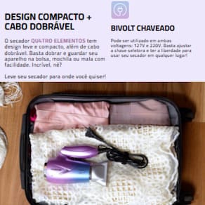 CABO DOBRÁVEL: O secador Qu4tro Elementos Colors tem design leve e compacto, além de cabo dobrável. Você dobra e encaixa seu aparelho na bolsa ou na mala com facilidade. Incrível, né? Leve seu secador para onde quiser!