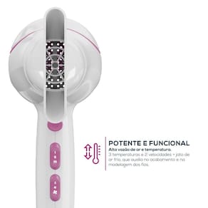 • 3 temperaturas • Funções Infrared, Tourmaline íon • Acessório concentrador de ar • Potência 2100W • Anel para pendurar • Grade traseira removível • Cordão 360° • 2 velocidades • Jato de ar frio • Motor DC.