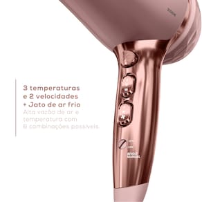 O aparelho conta com a tecnologia Íon Tourmaline, que sela as cutículas capilares para garantir cabelos macios, com brilho intenso e sem frizz. Com 6 combinações de ajuste (3 temperaturas e 2 velocidades), além do jato de ar frio, você tem total controle para modelar ou secar de acordo com a necessidade do seu tipo de cabelo.