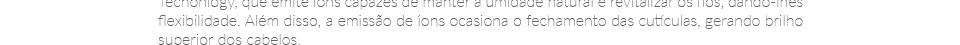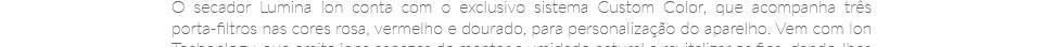O Secador de Cabelos Lumina Íon da GA.MA Italy conta com a tecnologia de íons negativos que auxiliam no fechamento das cutículas dos fios, diminuindo o efeito frizz, os fatídicos cabelos arrepiados. Além disso, os íons negativos mantêm a maciez, o brilho e a umidade natural dos cabelos.