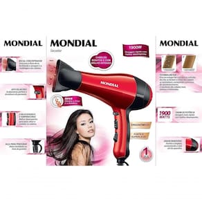 Secador De Cabelos Mondial 1900w Ion Tourmaline Red 220v Se você está procurando um secador potente e prático para secar os cabelos no dia a dia acaba de encontrar: Secador Mondial. Apresenta 1.900W, 3 temperaturas e 2 velocidades. Além disso, tem Tourmaline Íon que deixa os cabelos mais saudáveis, hidratados e com brilho. E para manusear é super fácil, pois além de ser leve, possui formato ergonômico.Características:Tourmaline Íon: elimina o frizz e a estáticaBocal direcionador: facilita a secagem e a modelagem dos cabelosAlça para pendurar: fácil de guardarErgonômico: auxilia no manuseioSuperleveAlto desempenho: 1900W de potênciaTourmaline: Potencializa a emissão de íonsCombina velocidades e temperaturas para modelar e secar os cabelos de acordo com sua necessidadeMaterial: PPEspecificações:Potência (W) 1900Voltagem 220V (Esse produto não é Bivolt)Cor Vermelho/PretoComprimento do fio 180 cmAcessórios 01 Bocal direcionadorConteúdo da Embalagem1 Secador de Cabelos Mondial 1 Bocal direcionador1 Manual de Instruções1 Manual de Assistência Técnica Ean: 7898490163519