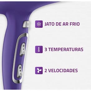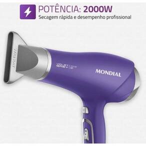 Cabelos secos, lindos e saudáveis em minutos! O Secador de Cabelo da Mondial é garantia de cabelos secos com maciez e brilho! O revestimento com Tourmaline Íon emite íons negativos, que fecham as cutículas dos fios e reduzem o frizz. Já a alta potência, de 2000W, proporciona uma secagem rápida e eficiente. O secador doméstico, possui 3 temperaturas, 2 velocidades e jato de ar frio: basta alternar entre as variações para uma secagem mais adequada ao seu tipo de cabelo. Além disso, com o jato de ar frio, você dá aquele choque de temperatura no final da secagem, reduzindo o frizz e ainda ajuda a fixar a modelagem. Ele vem nas cores Lilás e Prata, conta com grade de cerâmica, por onde sai o ar e distribui o calor de forma uniforme, minimizando os danos aos cabelos. Já o bocal direcionador, concentra e direciona o fluxo de ar, proporcionando mais precisão e facilidade para modelar os fios. E a grade traseira removível, facilita a limpeza e aumenta a vida útil do secador de cabelo. Seu cabo-plugue tem 1,8 metros de comprimento, garantindo mais autonomia de movimento. Ficha Técnica:Uso DomésticoCaracterísticas Revestimento com tourmaline íon, grade de cerâmica, bocal direcionador, grade traseira removívelTecnologia Tourmaline ÍonPotência 2000WVelocidades 2 VelocidadesTemperaturas 3 TemperaturasAcessórios 1 Bocal DirecionadorComprimento do Fio 1,8mTipo de Tomada 10AConsumo Aproximado de Energia 2,0Kw/hMaterial PP e MetalCor Lilás e PrataCertificado Homologado pela Inmetro Número UL-BR 21.0607Peso do Produto 0,62gPeso do Produto com Embalagem 0,77gDimensões do Produto Largura: 28,60cm, Altura: 28,70cm, Profundidade: 8,60cmDimensões do Produto com Embalagem Largura: 29,50cm, Altura: 26,00cm, Profundidade: 10,00cm