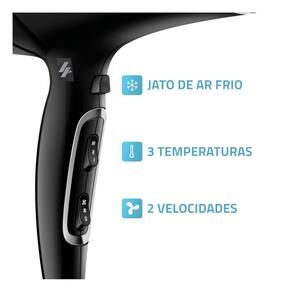 Especificações: - Modelo: SCN-04 - Cor: Preto/Cromado Prata - Voltagem (Tensão): 127V/220V (Não é Bivolt) - Peso: 0,550kg - Controle de temperatura: Sim - Potência: 2000W - Comprimento do cabo: 1,50cm - Grade traseira removível: Sim - Jato de Ar Frio: Sim