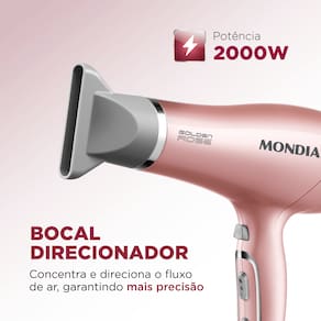 Para deixar seus cabelos mais brilhantes, bem modelados e macios o Secador Golden Rose é a opção ideal. Seguindo a tendência da moda, a Mondial arrasa nesta linha com a cor exclusiva Golden Rose. Um toque fashion, sofisticado e feminino para o dia a dia. Com ele, você seca seus cabelos mais rápido e com mais eficiência por causa da sua alta potência. A tecnologia Tourmaline Íon deixa seus cabelos selados, com mais brilho e suavidade. Do jeito que você gosta. Ainda tem outras vantagens: 2 velocidades e 3 temperaturas, formando 6 combinações que atendem a todos os tipos de cabelos e os penteados tão sonhados. E pode acreditar, o Golden Rose da Mondial é super silencioso. Para finalizar o look, invista no jato de ar frio para disciplinar os fios e conquistar o melhor resultado.