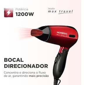 Potente e compacto: leve seu secador para onde quiser o secador max travel é a melhor opção para suas viagens. Por conta do cabo dobrável, cabe na bolsa ou mala com facilidade. Além disso, possui 1.200w de potência e proporciona uma secagem rápida. Saiba mais sobre o sc-10 da mondial: