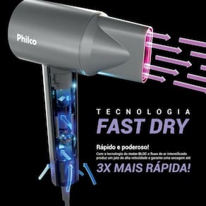 Além disso, o cordão de 1,8 metros oferece liberdade de movimento durante o uso. Já a tecnologia Fast Dry seca rapidamente com baixo nível de ruído, graças ao fluxo de ar com velocidade de 110.000 RPM.