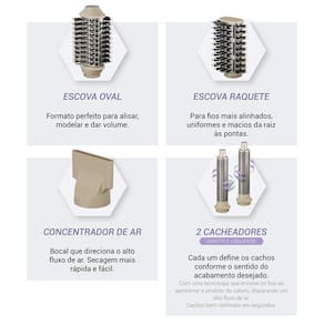 - 1 Secador Multifunções com 4 acessórios: 1 Cacheador Horário 1 Cacheador Anti -horário 1 Escova Oval 1 Escova Raquete 1 Bocal Concentrador de Ar