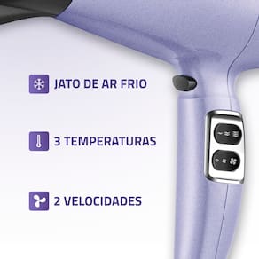 3 TEMPERATURAS + 2 VELOCIDADES Melhor desempenho para secar, alisar e modelar. Alterne entre as variações de velocidade e temperatura para uma secagem mais adequada aos diferentes tipos de cabelo.