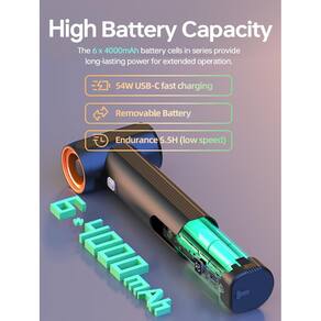 - Secador de carro portátil com vida útil da bateria de 5,5h – equipado com seis baterias de alto desempenho de 4000mAh em série, proporcionando uma energia total de 86,4 Wh. Com carregamento rápido de 54W, o ventilador turbo secador KiCA carrega rapidamente e oferece até 5,5 horas de uso contínuo.