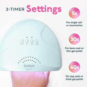 - Secagem rápida e ampla compatibilidade: o tempo médio de cura é reduzido em 50% com SUNUV. Cura rapidamente todas as suas marcas favoritas de gel para unhas, do iniciante ao profissional. O tempo exato de cura dos esmaltes de gel pode ser encontrado na embalagem do produto ou nos manuais do usuário