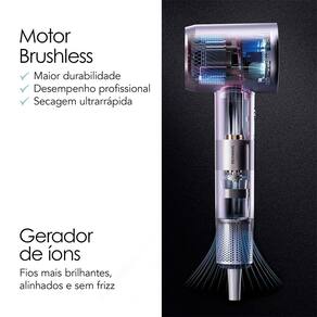 Motor Brushless: Tecnologia de nova geração com performance superior. Fluxo de ar potente, maior durabilidade e o dobro da velocidade para uma secagem rápida e desempenho profissional.