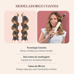 O tubo modelador de 28 mm, com a tecnologia Coanda, usa um fluxo de ar potente e direcionado para atrair e enrolar seu cabelo, criando cachos e ondas sem a necessidade de calor extremo.
