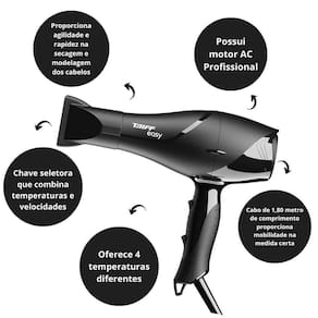 Praticidade ao seu alcance. Essa é a definição perfeita para o secador Easy. Com 1700W de potência, é ideal para uso pessoal, proporcionando agilidade e rapidez na secagem e modelagem dos cabelos. Possui motor AC Profissional com maior durabilidade, chave seletora que combina temperaturas e velocidades, oferecendo 4 temperaturas diferentes. E o cabo de 1,80 metro de comprimento proporciona mobilidade na medida certa.