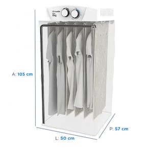 Por dentro, a secadora impressiona. Sua câmara de secagem em PVC garante uma distribuição uniforme das roupas, contribuindo para uma secagem mais rápida e eficiente. Com 6 varões e 5 cabides, as peças ficam bem posicionadas, evitando frisos, marcas e amassados indesejáveis, é quase como estender no varal, só que muito mais rápido.