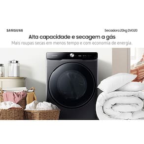 A Secadora de Roupas a Gás Samsung DVG20 é ideal para você que valoriza comodidade e praticidade todos os dias. Com a DVG20 você terá mais praticidade no seu dia a dia com a secagem a gás, que agiliza o processo e ainda economiza energia. Com 20kg de capacidade, é o modelo ideal para grandes famílias. Com um painel de controle intuitivo, essa secadora inteligente e conectada identifica os hábitos de secagem mais utilizados, recomenda os ciclos ideais e ainda exibe durante a secagem as informações mais importantes. Quer tornar o processo ainda mais simples? Com o app SmartThings você pode planejar sua secagem, obter dicas e recomendações e receber ajuda para conservar sua máquina. Um sensor preciso detecta o nível de umidade interna, otimizando a duração do ciclo de secagem e a temperatura, e evitando que os tecidos sejam expostos tempo demais desnecessariamente.