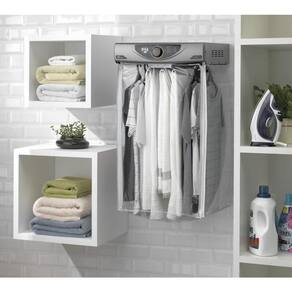 Características: Função: secar Temperatura máxima de 65ºC no interior do bag câmera de secagem Timer com ciclo máximo de 120min 2h , sendo15 minutos com ar frio ciclo amaciante e ciclo contínuo Bag em PVC cristal Fechamento por zíper Frontal em termoplástico com indicações dos tempos de secagem Corpo externo em aço pintado 3 varais fixos 6 cabides removíveis