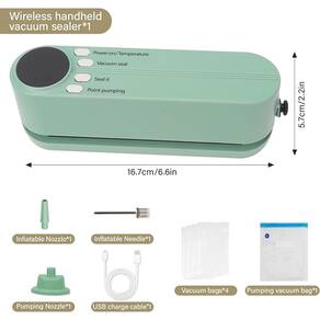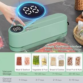 Material: plástico Cor: verde Tamanho da embalagem: 16,4 x 4,3 x 5,6 cm Peso da embalagem: 0,4 kg Lista de embalagem: 1 x máquina de selar Esta versátil seladora a vácuo oferece três funções: “vedação a vácuo” para carnes e vegetais, “selagem” para lanches e “bombeamento pontual” para alimentos macios ou úmidos, oferecendo flexibilidade na vedação. Equipado com uma potente bomba de sucção de 60 kPa, este mini selador a vácuo completa o processo de vedação em 10 a 20 segundos, garantindo o armazenamento eficiente dos alimentos e evitando a deterioração. O display digital intuitivo facilita a seleção de modos e tempos de vedação, com indicadores LED para uma operação clara, permitindo que você sele rapidamente vários alimentos. Esta seladora a vácuo compacta e portátil é perfeita para casa, viajar ou acampar. Ele reduz o desperdício de alimentos, mantém lanches e carnes frescas e pode até mesmo inflar bolas esportivas. Recarregável com uma bateria de lítio de 1200mAh, este selador oferece até 60 usos por carga, tornando-o uma opção conveniente e com baixo consumo de energia para o uso diário.