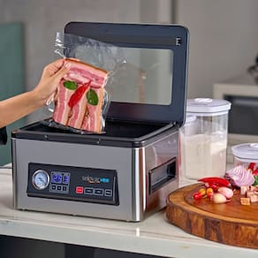 Seladora a Vácuo de Câmara Selovac NEO LNS40. Ideal para cozinhas residenciais e pequenos comércios. Indicado para criar vácuo em sacos e potes, marinar com perfeição e selar embalagens de forma prática e versátil. A embalagem a vácuo prolonga a vida útil do alimento de 3 a 7 vezes em relação ao armazenamento convencional. Feita em aço inox. Possui 5 funções em um único equipamento: Vácuo no saco, vácuo no pote, marinação no saco ou no pote, líquidos e selagem de embalagens. Vacuômetro. CONSUMO: 0,30kW/h. POTÊNCIA: 300W. CAPACIDADE DA CÂMARA: 4L. TAMANHO DE EMBALAGEM MÁXIMO: 30x30cm. PESO: 8,5kg. DIMENSÕES(CxAxL): 34,5x22,5x28,5cm. Seladora a Vácuo de Câmara Selovac NEO LNS40 é na Atau. Marca: Não Informado
