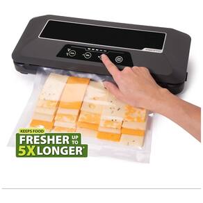 Este produto é uma máquina de selagem a vácuo com vedação hermética que mantém os alimentos frescos por até 5x mais tempo do que os métodos convencionais. Possui um compartimento de armazenamento de rolo de saco e cortador embutido, permitindo a criação de sacos de comprimento personalizado. Além disso, possui configurações para alimentos úmidos ou secos, somente selo, selo a vácuo e StopPulse. O pacote inclui um rolo de 27 cm x 50 cm e um saco reutilizável com zíper de tamanho de galão com porta, bem como um acessório de tubo de vácuo para uso com sacos com zíper com portas. Os modos úmido e seco são ideais para vegetais, frutas, carne, peixe, nozes, arroz, biscoitos e muito mais. Os botões de toque suave permitem selecionar modos de alimentos e funções de selagem. É perfeito para selar alimentos sous vide em sacos a vácuo para resultados perfeitos. A função StopPulse oferece controle manual de pressão para alimentos macios e delicados. A máquina funciona com FreshDaddy e a maioria das outras marcas de sacos e rolos, e tem um cabo removível.