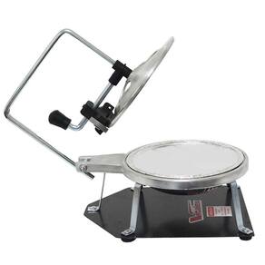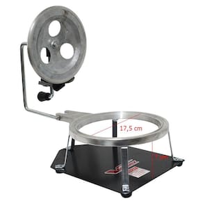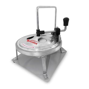 O uso da seladora é muito simples: basta acoplar a marmita no aro, colocar a tampa, abaixar a parte superior que possui roldanas e girar até que a borda da marmita seja lacrada.