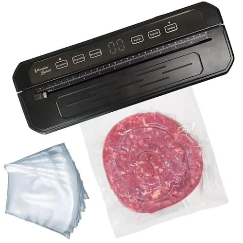Seladora a vácuo com temporizador de selagem por calor controlado, totalmente automatizado. Possui fivelas de trava que fixam os saquinhos com firmeza durante a selagem e um cortador de embalagens embutido. Reduz a deterioração dos alimentos em até 5 vezes, mantendo-os mais frescos.Tipo