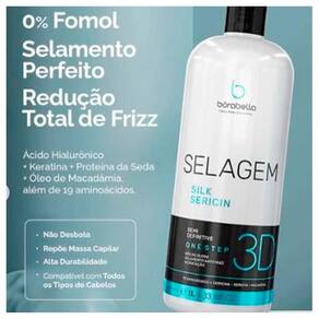 A Borabella Selagem 3D Semi Definitiva 1L proporciona cabelos selados, disciplinados, soltos, leves, macios, com brilho intenso, volume controlado, completamente livre do frizz e dos fios rebeldes. Nossa formulação contém ativos orgânicos modernos, e o exclusivo Blend Bio Complex formado pela sinergia de óleos vegetais, proteínas e aminoácidos que provem a reordenação da estrutura do córtex e da cutícula capilar, resultando em cabelos naturalmente soltos, macios, comportados e brilhante por um longo período.
