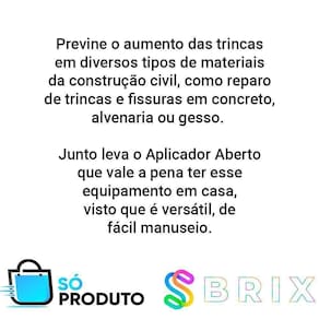 DescriçãoPrevine o aumento das trincas em diversos tipos de materiais da construção civil, como reparo de trincas e fissuras em concreto, alvenaria ou gesso. Junto leva o aplicador aberto que vale a pena ter esse equipamento em casa, visto que é versátil, de fácil manuseio.DetalhesCorrige fissuras e trincas, deixando a superfície lisa e uniforme. EspecificaçõesKitSelante acrílico branco preenche fissura trincaMarca sbrixQuantidade 01 unidadeTipo cartuchoPeso 450 g 310 mlCor brancoValidade: 24 mesesAplicador aberto Quantidade 01 unidadeCor laranjaMaterial: açoComprimento: 35 cmAltura: 20 cmLargura: 6 cmPeso: 0,42 kgCaracterísticasÉ ideal para ser utilizado como selador e para retirar as incrustações na pintura. As imagens são meramente ilustrativas