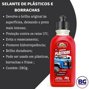 Selante de Plástico e Borrachas 280g Proauto Bem Vindos a nossa Loja Despachamos o mais rápido possível Selante de Plásticos e Borrachas 280g - Proauto -pode ser Utilizado tanto nas áreas externas como internas; -previne o ressecamento; -proporciona o brilho duradouro; -protege contra os raios UV; -promove hidrorrepelência. Modo de Uso: Aplique algumas gotas do produto em uma esponja e espalhe uniformemente sobre a superfície desejada.