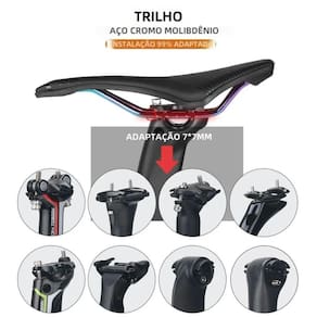 CARACTERÍSTICAS A superfície da sela é feita de couro de microfibra de alta qualidade, que é elegante e fácil de limpar. O interior do selim é preenchido com EVA, um material absorvente de choque leve que garante uma condução suave em qualquer terreno. Pesando apenas 221g, é leve e uma ferramenta de redução de peso para sua bicicleta. O trilho de guia circular 7x7mm é adequado para a instalação de mais de 99% de selins de bicicleta. É a prova d´água. Frente redonda e design de transição estreito e arredondado. A seção frontal e estreita e as duas seções são redondas garantindo que as coxas não fiquem obstruídas e as coxas não sejam friccionadas.