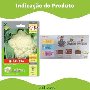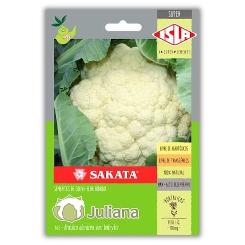 Características * Variedade: Couve-Flor Híbrido Juliana * Nome científico: Brassica oleracea var. botrytis * Formato: Cabeça compacta e arredondada * Ciclo Anual: Anual * Ciclo de Verão: 105 dias * Exposição solar: Mínimo 3 horas de sol por dia * Germinação: 5 a 10 dias * Transplante: Quando atingir aproximadamente 10 cm de altura * Espaçamento mínimo: 100 x 50 cm * Profundidade de plantio: 0,5 cm * Colheita: Aproximadamente 105 dias após o plantio * Diâmetro médio da cabeça: 20 – 25 cm * Sementes livres de transgênicos e agrotóxicos * 100% natural e de alto desempenho * Quantidade de Sementes por grama: 182 * Renascem: RS-05567/2019