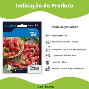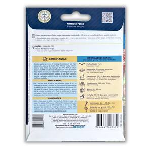 Características: * Nome Científico: Capsicum Annuum * Germinação: 7 a 14 dias * Profundidade da Semeadura: 1 cm * Espaçamento: 120 cm x 50 cm * Altura da Planta: 70 a 90 cm * Transplante: 25 a 30 dias após a germinação * Colheita: 70 a 90 dias após a semeadura * Sementes por Grama: 200 a 250 * Pureza: 99% * Germinação: 82% * Peso Líquido: 2,5 g * Clima Indicado: Quente e Temperado * Renascem: SP-17443/2019