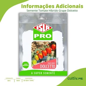 Descrição * As Sementes de Tomate Híbrido Grape Dolcetto ISLA são ideais para quem busca cultivar tomates tipo grape de coloração vermelho-intensa e sabor adocicado incomparável. * Seus frutos pesam cerca de 15g cada e apresentam excelente uniformidade, ótima resistência a rachaduras e aparência premium, ideais tanto para consumo fresco quanto para comercialização. * De sabor doce e equilibrado, alcançando até 11º de brix, o Tomate Dolcetto é perfeito para saladas, petiscos, molhos e acompanhamentos gourmet. * A planta é vigorosa e produtiva, indicada para cultivo protegido, garantindo colheitas estáveis e frutos de alta qualidade. * Além disso, apresenta resistência à Murcha de Fusário (raças 1 e 2 – Fol: 01), Vírus do Mosaico do Tomate (ToMV) e Murcha de Verticílio (Va). * Livre de transgênicos, é uma excelente escolha para o cultivo sustentável e de alto rendimento. * Dica de cultivo: mantenha o solo fértil, bem drenado e sempre úmido. O tomateiro precisa de boa luminosidade para garantir frutos doces e brilhantes.