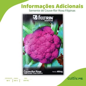 Sementes De Couve-flor Roxa Filipinas FELTRIN Descrição * As Sementes de Couve-flor Roxa Filipinas FELTRIN são ideais para quem busca uma hortaliça diferenciada, nutritiva e de excelente valor comercial. * Essa variedade se destaca pela coloração roxa, cabeças bem formadas e ótimo rendimento * Sendo uma excelente opção tanto para hortas domésticas quanto para produtores profissionais. * A couve-flor Roxa Filipinas apresenta bom desenvolvimento em diferentes épocas do ano, com plantas vigorosas e adaptadas às condições de cultivo no Brasil Características * Variedade: Couve-Flor Roxa Filipinas * Nome científico: Coliflor Morado - Purple Cauliflower * Formato: Cabeça roxa * Coloração: Roxa * Cultivo: No inverno (10 a 25º) * Ciclo: Anual * Germinação: Aproximadamente 6 a 12 dias * Transplante: Quando as mudas atingirem 10 cm de altura * Espaçamento mínimo: 80 x 50 cm * Colheita: Cerca de 120 dias após o plantio * Quantidade por embalagem: 400 mg * Quantidade aproximada de sementes por grama: 410 * Renascem: RS-00013/2005 A Feltrin Sementes é uma empresa brasileira tradicional no mercado de sementes de hortaliças e plantas, reconhecida por oferecer sementes de alta qualidade, genética diferenciada e excelente desempenho agronômico. Nós da CULTIV.ME trabalhamos desde 2013 para trazer os melhores produtos ao alcance de todos. CULTIV.ME o verde que faltava!