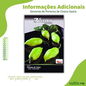 Sementes De Pimenta de Cheiro Sasha FELTRIN Descrição * As Sementes de Pimenta de Cheiro Sasha FELTRIN são ideais para quem deseja cultivar uma pimenta aromática, suave e muito apreciada na culinária brasileira. * A variedade Sasha se destaca pelo excelente perfume, frutos de formato irregular e coloração verde claro no ponto de colheita e amarelo-clara quando maduros * Agregando sabor e valor às receitas. * Possui plantas vigorosas e produtivas, sendo indicada tanto para hortas domésticas quanto para cultivo comercial. * Desenvolvida com genética tropical, apresenta ótima adaptação às condições climáticas do Brasil e boa produtividade ao longo do ciclo. Características * Variedade: Pimenta de Cheiro Sasha * Nome científico: Aji Olor - Smelling Pepper * Tipo: Pimenta de cheiro (aromática, baixa pungência) * Coloração dos frutos: Verde-claro a amarelo quando maduros * Formato dos frutos: Irregular * Ciclo: Anual * Germinação: Aproximadamente 7 a 14 dias * Transplante: Quando as mudas atingirem cerca de 15 cm de altura * Espaçamento mínimo: 120 x 80 cm * Colheita: Em média 100 a 110 dias após o plantio * Cultivo indicado: Clima quente a ameno * Sementes por grama: aproximadamente 150 * Registro RENASEM: RS-00013/2005 A Feltrin Sementes é uma empresa brasileira tradicional no mercado de sementes de hortaliças e plantas, reconhecida por oferecer sementes de alta qualidade, genética diferenciada e excelente desempenho agronômico. Nós da CULTIV.ME trabalhamos desde 2013 para trazer os melhores produtos ao alcance de todos. CULTIV.ME o verde que faltava!