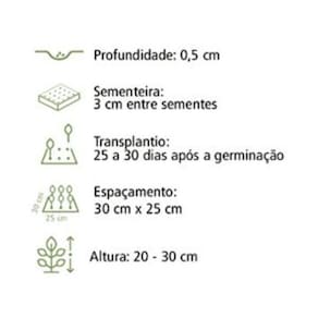 SEMENTES DE SALVIA 200mg Nome cientifico: Salvia officinalis. Como plantarRevolva o solo no mínimo 20 cm de profundidade até que fique solto, sem a presença de torrões. Para melhorar o solo, adicione esterco e/ou húmus na proporção de 10%. Misture adubo balanceado NPK considerando 300g para cada 10m2 de canteiro. Para plantio em vasos, use substrato e adicione 5g de adubo por litro de vaso. Semeie conforme a tabela ao lado. Após o plantio, manter o solo e/ou substrato úmido, sem encharcar, para obter melhores resultados.Germinaçao4 a 21 diasSementes por grama120 a 140