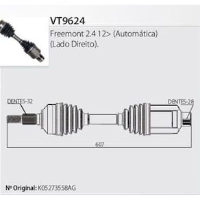 Semi Eixo Freemont 2.4 2012 2013 2014 2015 2016 2017 2018 2019 2020 Automática - Lado DireitoSemi Eixo Freemont 2.4 2012 2013 2014 2015 2016 2017 2018 2019 2020 Automática - Lado Direito32 dentes lado roda e 28 dentes lado câmbio Aplicação FiatFreemont 2.4 - 2012, 2013, 2014, 2015, 2016, 2017, 2018, 2019, 2020 - Lado direito e câmbio automático Nº original: K05273558AGComprimento: 607mm Garantia6 meses pelo fabricante ObservaçãoServe nos modelos com 4 marchas e no modelo 6 marchas.Recomendamos a contratação de um profissional qualificado para instalação da peça. Não nos responsabilizamos por danos devido ao mau uso do produto.