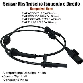 Sensor abs traseiro direito e esquerdo Aplicação: Fiat argo 2017 em diante Fiat cronos 2018 em diante Fiat fastback 2022 em diante Fiat pulse 2022 em diante Características: - ótima qualidade e durabilidade. Especificações: - traseiro - direito e esquerdo - comprimento: 77 cm - sensor: 38 mm - conector: 2 pinos - tipo: hall Códigos: 52137654 52064613 30070tdte svr2028 gs2003 120294 Dúvidas frequentes Qual horário de atendimento O horário de atendimento é das 08:00 às 17:30 hrs. Ainda tem dúvidas Utilize o campo de perguntas em caso de dúvidas e somente clique em comprar após a plena certeza em honrar a compra e concordar com as condições descritas acima. Importante Não nos responsabilizamos por instalação mal realizada; a instalação deve ser feita por um especializado. De um novo visual para o seu carro, aqui você encontra os melhores produtos com os melhores preços Imagem meramente ilustrativa. Marca: Não Informado Ean: 7908295243351