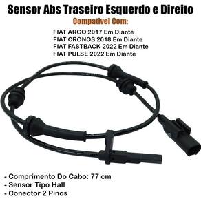 Sensor abs traseiro direito e esquerdo Aplicação: Fiat argo 2017 em diante Fiat cronos 2018 em diante Fiat fastback 2022 em diante Fiat pulse 2022 em diante Características: - ótima qualidade e durabilidade. Especificações: - traseiro - direito e esquerdo - comprimento: 77 cm - sensor: 38 mm - conector: 2 pinos - tipo: hall Códigos: 52137654 52064613 30070tdte svr2028 gs2003 120294 Dúvidas frequentes Qual horário de atendimento O horário de atendimento é das 08:00 às 17:30 hrs. Ainda tem dúvidas Utilize o campo de perguntas em caso de dúvidas e somente clique em comprar após a plena certeza em honrar a compra e concordar com as condições descritas acima. Importante Não nos responsabilizamos por instalação mal realizada; a instalação deve ser feita por um especializado. De um novo visual para o seu carro, aqui você encontra os melhores produtos com os melhores preços Imagem meramente ilustrativa. Marca: Não Informado