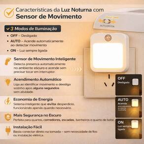 Descrição: Luz noturna com sensor de movimento que acende automaticamente ao detectar presença em ambientes com pouca luminosidade, oferecendo mais segurança, conforto visual e economia de energia. Possui iluminação suave com proteção ocular, brilho ajustável e modos de uso que permitem funcionamento automático, desligado ou sempre ligado. Compacta, discreta, sem fio e fácil de instalar, é ideal para corredores, escadas, quartos e banheiros. Informações Técnicas: