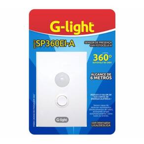 - Marca: G-light; - Modelo: SP360E-A; - Linha: Sensor de presença; - Fotocélula para acionamento a noite ou dia e noite; - Led de indicação de acionamento de carga; - Tensão de Alimentação: 110V-220V; - Potencia máxima de controle: 800W em 110V / 1200W em 220V; - Alcance máximo aproximado: 6 Metros; - Tipo de lente: 360; - Fusível de proteção: 7 amperes; - Tempo de acionamento da carga ajustável: 5 seg / 1 Min / 5 Min / 8 Min; - Iluminação ambiente: < 25Lux; - Altura de instalação: 2 a 3 metros.