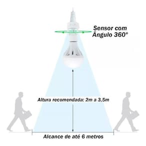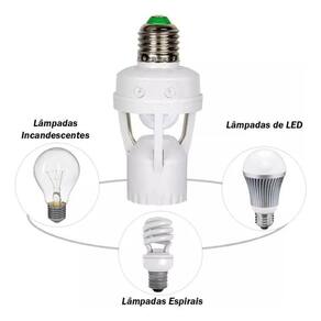 Sensor de presença com soquete bocal E27 para lâmpadas. Fácil de instalar, basta rosquear como uma lâmpada. Economia de até 80% de energia. Acionamento automático sensor de movimento . Compatível com lâmpadas LED, fria, negra, fluorescente ou incandescente de até 60 W soquete E27 . Detecta a movimentação de corpos quentes, pessoas, animais de médio e grande porte e objetos por meio de sensor infravermelho que reconhece as fontes de calor. Bivolt automático 110 - 220V. Frequência da rede elétrica 50/60 Hz;Vida útil de 30.000 horas.Ajuste de tempo e luminosidade modo dia e noite.Distância máxima de detecção 6 m a 24 C . Ângulo de detecção 360.Altura de instalação 2 a 3,5 m.Temperatura de operação 0 a 40 C.Ajuste de tempo: 8 a 120 segundos.Não obstrua o sensor com globos ou qualquer proteção decorativa. Para o funcionamento o interruptor do ponto de energia onde o sensor estiver instalado deve permanecer sempre na posição ligado, para que o sensor seja energisado.