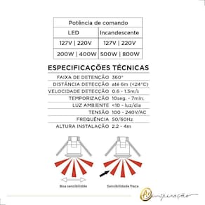 Cor: Branco Angulo: 360 Tensão: 100 - 240V/AC Frequência: 50/60Hz Potência LED: 127V - 200W 220V - 400W Potência Incandescente: 127V - 500W 220V - 800W Distância de detecção: Até 6m 24/C Velocidade de detecção: 0.6 - 1.5m/s Temporização: 10seg. - 7min. Luz ambiente: 10 - LUX/dia Altura de instalação: 2.2 - 4m Grau de proteção: IP20 Peso: 50g Composição: Policarbonato Conteúdo: 1 sensor Instalação em teto para uso frontal embutido; Configuração de tempo; Configuração fotocélula; Ajuste de sensibilidade; Uso interno; Ean: 7898589036991