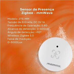 Sensor de presença humana Zigbee - mmWave NovaDigital Maximize a eficiência energética e segurança do seu ambiente com o Sensor de Presença Humana da NovaDigital Este sensor inovador, desenvolvido pela NovaDigital, é a solução ideal para automação residencial e empresarial. Com tecnologia Zigbee e mmWave, garante detecção precisa de movimentos, proporcionando maior comodidade e controle de iluminação, climatização e outros dispositivos conectados. Diferenciais: Tecnologia avançada: O Sensor de Presença Humana Zigbee da NovaDigital utiliza ondas milimétricas para identificação precisa de presença, garantindo segurança e eficiência. Integração inteligente: Possibilita a integração com outros dispositivos IoT, ampliando as funcionalidades de automação. Design discreto: Com dimensões compactas, pode ser facilmente instalado em qualquer ambiente, sem interferir na estética do local. Mais sobre o Produto: Detecção de presença humana: Detecta movimentos e presença, acionando dispositivos conectados automaticamente. Eficiência energética: Permite programar o funcionamento de aparelhos conforme a presença de pessoas no ambiente, otimizando o consumo de energia. Segurança: Contribui para o monitoramento e segurança do ambiente, ativando alarmes ou câmeras em caso de detecção de movimentos suspeitos. Dicas de Uso: Instalação estratégica: Posicione o sensor em locais estratégicos para garantir uma detecção eficiente de presença. Programação inteligente: Utilize a integração com o HUB Zigbee para criar cenários personalizados conforme suas necessidades. Manutenção regular: Mantenha o sensor limpo e sem obstruções para assegurar o funcionamento correto. Ficha Técnica: Marca: NovaDigital Modelo: Sensor de Presença Humana Zigbee - mmWave NovaDigital Tecnologia: Zigbee e mmWave Dimensões: Conforme especificações do fabricante Aplicativos: JWCOM, Ekaza, Android, Tuya, Smart Life e NovaDigital. : 12 meses contra defeitos de fabricação da NovaDigital. Observação: é importante ter uma rede Wi-Fi 2,4GHz com boa capacidade para gerenciar os dispositivos de forma eficaz. Instabilidades na conexão podem interferir na resposta aos comandos via aplicativo e assistentes de voz, e na execução de rotinas automáticas. Recomenda-se consultar um técnico da operadora para garantir uma conexão estável. ATENÇÃO: Este produto necessita da utilização do HUB ZIGBEE para funcionar corretamente. Homologação Anatel: 149822010251 Marca: Não Informado