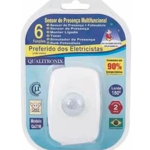 Especificação:- Sensor de presença de sobrepor na parede;- Para qualquer tipo de lâmpada;- Com fotocélula;- Bivolt;- Lente: 180°- Material em ABS na cor Branca;- Instalar em ambiente interno, caso seja instalado em ambiente externo deverá ser livre de intempéries (chuva e luz do sol);- Regulagem de tempo: 1s, 15s, 2mim., 3min., 5min., 7mim., 8min.,- Recontagem de tempo automático a partir da última detecção;- Alcance máximo a 25°C de 10 metros;- Consumo máximo a2.5W a 8W;- Liga e desliga a lâmpada no zero da senoide aumentando a vida útil do produto e da lâmpada;- Fixação e desliga a lâmpada no zero da senoide aumentando a vida útil do produto e da lâmpada;- Fixação por parafusos:Funções:- Sensor de Presença + Fotocélula;- Sensor de Presença;- Manter Ligado;- Timer;- Simulador de Presença;- Relé Fotocélula
