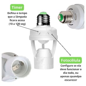 - O sensor suporta lâmpadas de soquete E27, incluindo incandescentes de até 60W, LED de até 9W e fluorescentes de até 18W.